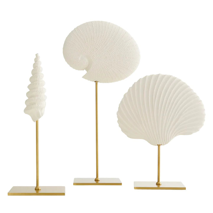 A COLLECTION OF THREE WHITE RESIN SPECIMENS TO BRING ATTENTION TO ANY TABLE TOP. EACH SHELL FORM STANDS ATOP A SLENDER STEEL BASE FINISHED IN ANTIQUE BRASS.