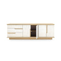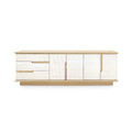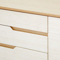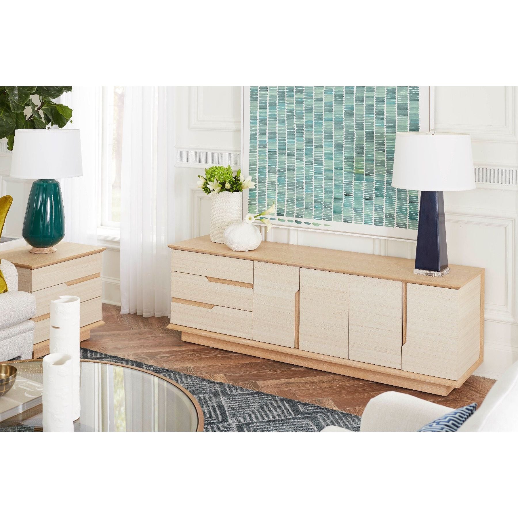 Crafted from solid oak, the Simon 3-Drawer & 4-Door Cabinet exudes a timeless elegance that will captivate your senses. The organic grain patterns and rich hues of the wood create a warm and inviting ambiance, while the Clear Lacquered Silky Grasscloth adds a touch of refined texture. Designed to make a statement, this piece sits proudly on a platform base of Cerused Oak, showcasing its sleek and modern silhouette. The cutouts, cleverly integrated into the design, not only serve as pulls for the drawers and doors but also expose the same beautiful wood, creating a harmonious and seamless aesthetic. The versatility of this cabinet complements a variety of spaces, whether it be a living room, family room, library, or bedroom. Its modern appeal seamlessly blends with any interior decor style, from contemporary and minimalist to transitional and eclectic.