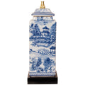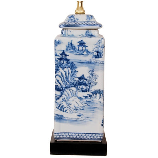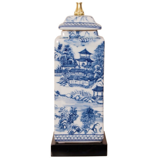 Square jar lamp with a canton pattern and black base. Off-white shade.