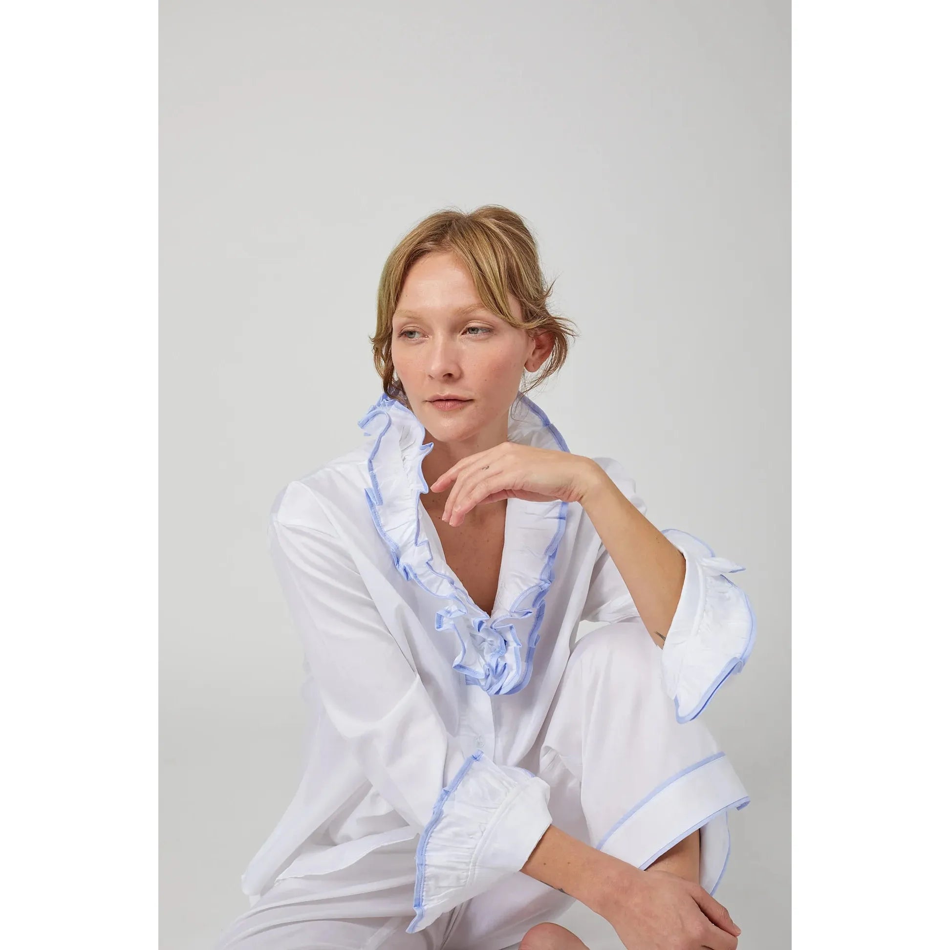 100% White Cotton Santeen pajamas with ruffle neck and sleeve