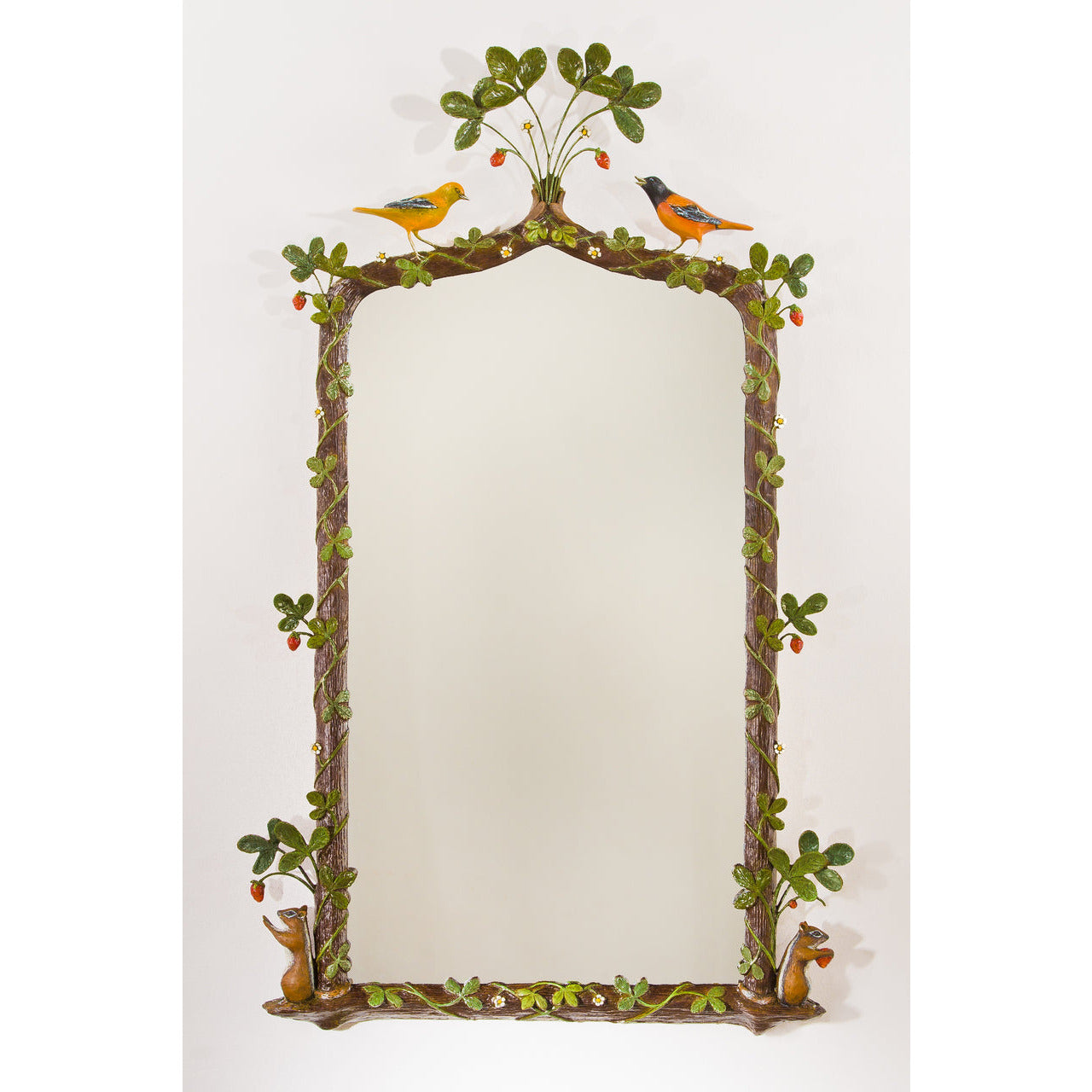Inspired by William Morris' fabric of the same name, Carol Canner's Strawberry Thief is a masterpiece. Fully sculpted Baltimore orioles and chipmunks reach for tantalizing strawberries, animating a Gothic twig frame. Charming in a Hand-Painted Finish, sophisticated in antique gold or sterling silver leaf. Please contact us for custom color options. **Average lead time is 6-8 weeks for this item.** Available in Gold or Hand Painted Finish. 27 x 44"