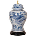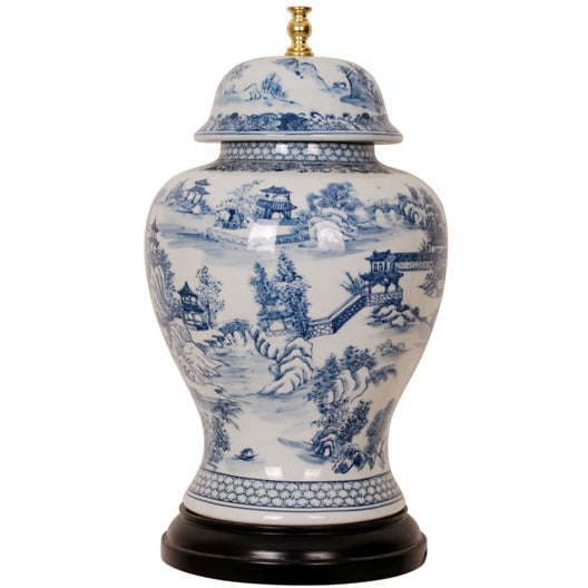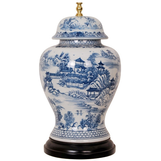 Temple Jar-shaped lamp with a black base. A foo dog finial accents this chinoiserie lamp. Off-white hexagon lamp shade.