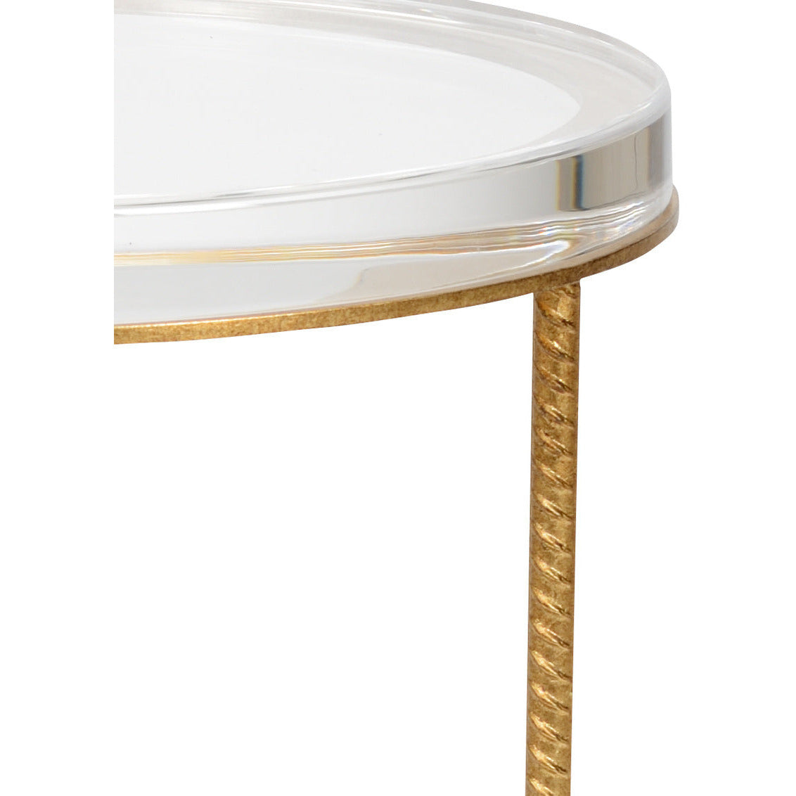 The Yonkers Side Table dons a gold, rope-detailed base an acrylic table top. Gold leaf iron acrylic 15" dia x 21"h